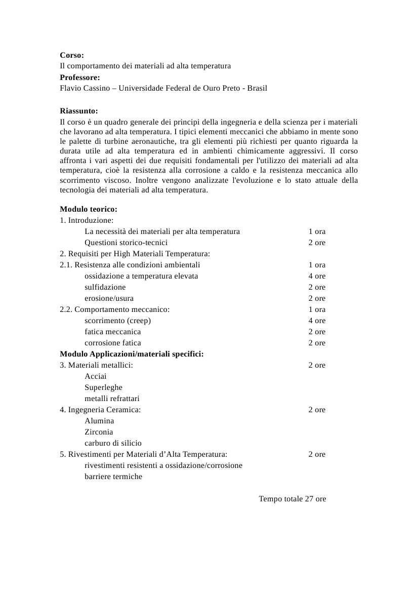 Il corso è un quadro generale dei principi della ingegneria e della scienza per i materiali che lavorano ad alta temperatura. I tipici elementi meccanici che abbiamo in mente sono le palette di turbine aeronautiche, tra gli elementi più richiesti per quanto riguarda la durata utile ad alta temperatura ed in ambienti chimicamente aggressivi. Il corso affronta i vari aspetti dei due requisiti fondamentali per l’utilizzo dei materiali ad alta temperatura, cioè la resistenza alla corrosione a caldo e la resistenza meccanica allo scorrimento viscoso. Inoltre vengono analizzate l’evoluzione e lo stato attuale della tecnologia dei materiali ad alta temperatura.