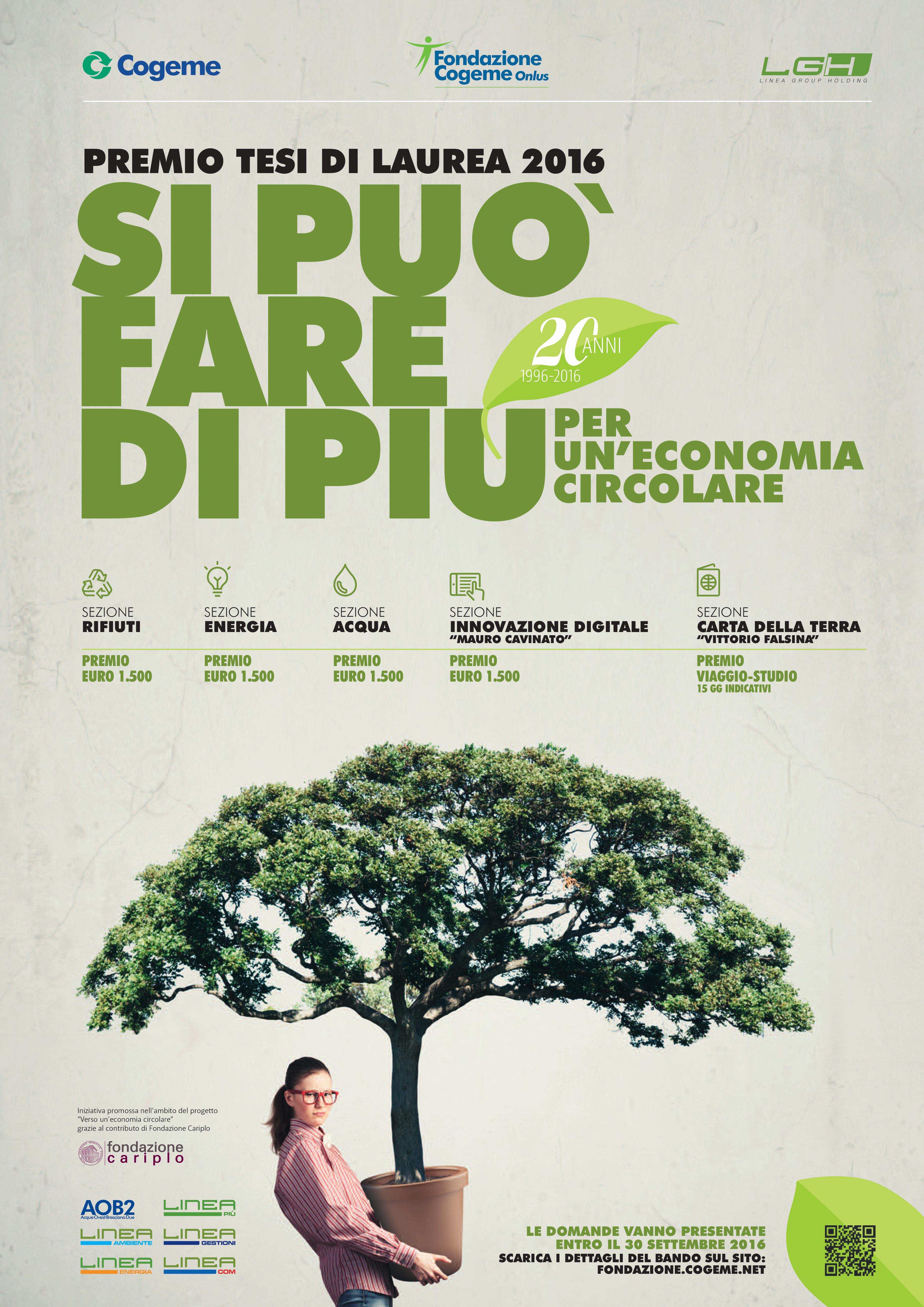La Fondazione Cogeme Onlus in collaborazione con Cogeme Spa, società a capitale interamente pubblico, e con le società legate a Linea Group Holding e AOB2, promuove il concorso annuale per premiare tesi di laurea di particolare interesse scientifico nell’intento di incoraggiare e sviluppare gli studi inerenti le proprie attività e legati a una visione sostenibile e integrata di sviluppo del territorio.