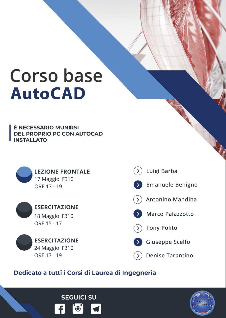 Difficoltà con AutoCAD? L’associazione studentesca Vivere ingegneria ha il piacere di invitarvi al Corso Base di AutoCad. Il corso è consigliato agli studenti del primo anno di: