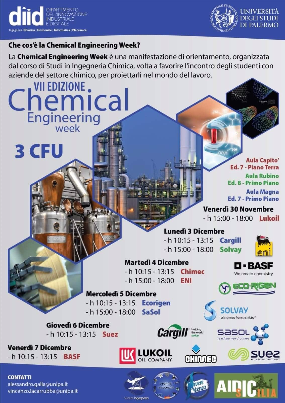 Come ogni anno torna la tanto attesa CHEMICAL ENGINEERING WEEK , che per la VII EDIZIONE permette agli studenti del 3° anno LT e 2° anno LM del corso di laurea in Ingegneria Chimica di interfacciarsi con le aziende partecipanti all’ evento. Tale evento è organizzato dal Prof. Vincenzo La Carrubba.