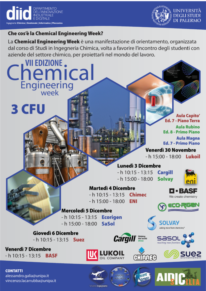 Come ogni anno torna la tanto attesa CHEMICAL ENGINEERING WEEK , che per la VII EDIZIONE permette agli studenti del 3° anno LT e 2° anno LM del corso di laurea in Ingegneria Chimica di interfacciarsi con le aziende partecipanti all’ evento. Tale evento è organizzato dal Prof. Vincenzo La Carrubba.