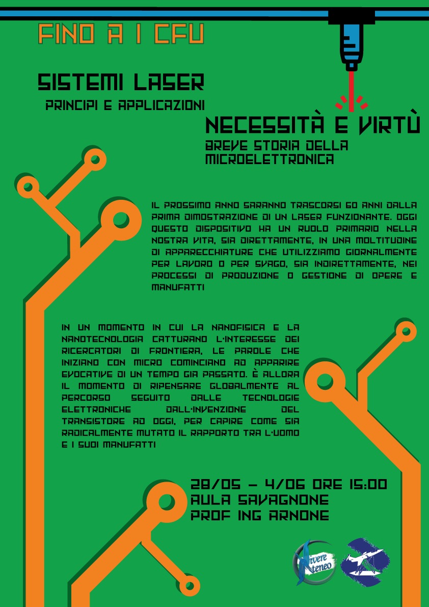 Vivere Ingegneria è lieta di invitarvi al Seminario “Necessità e virtù: breve storia della microelettronica” e “Sistemi laser: principi e applicazioni”, che si svolgerà in Aula Savagnone ( Ed. 9 ) dalle ore 15.00.