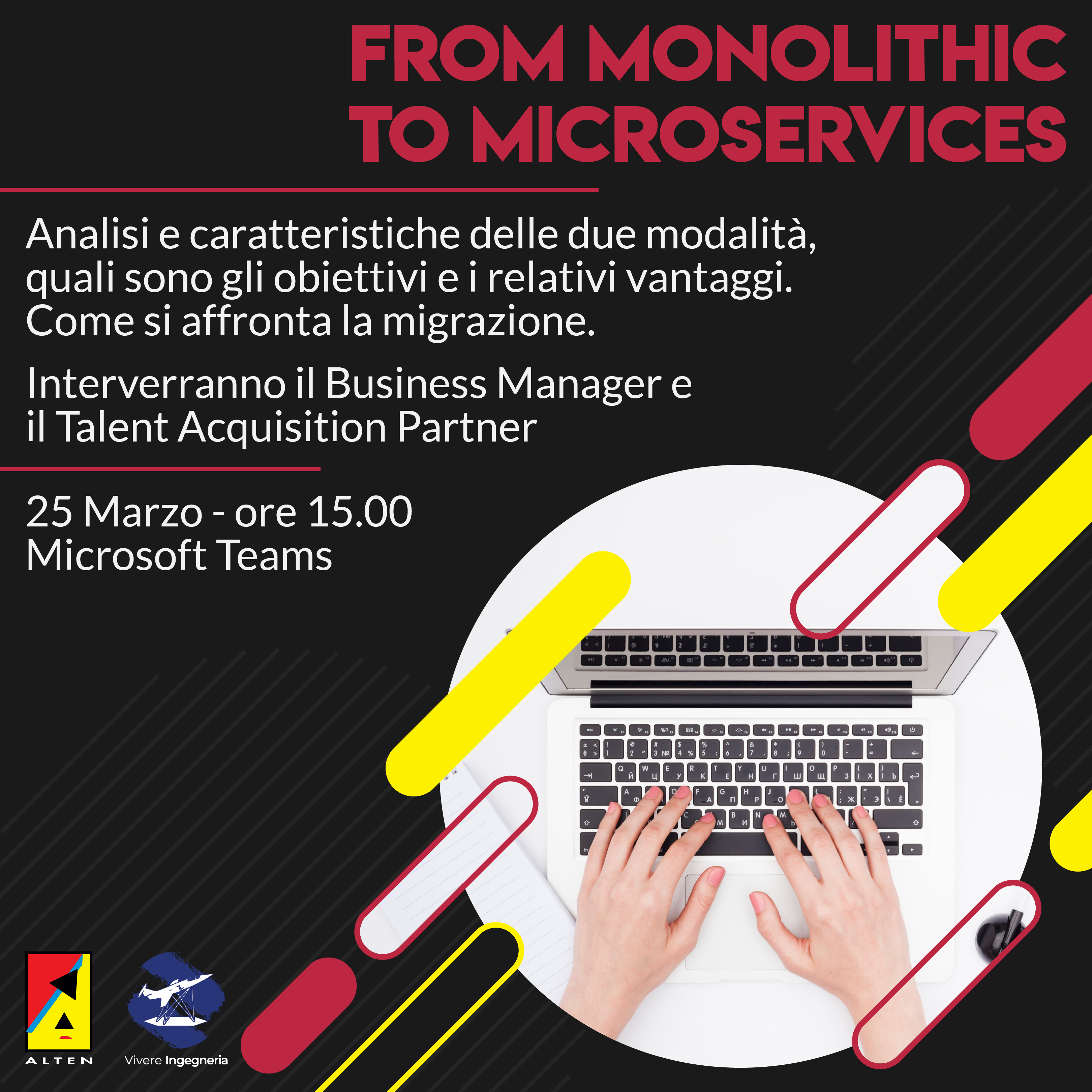 L’associazione studentesca Vivere Ingegneria è lieta di invitarvi al nuovo seminario “From Monolithic to Microservices“, in collaborazione con ALTEN Italia, filiale italiana del Gruppo ALTEN, leader europeo nella consulenza tecnologica avanzata in ambito ingegneristico e ICT.