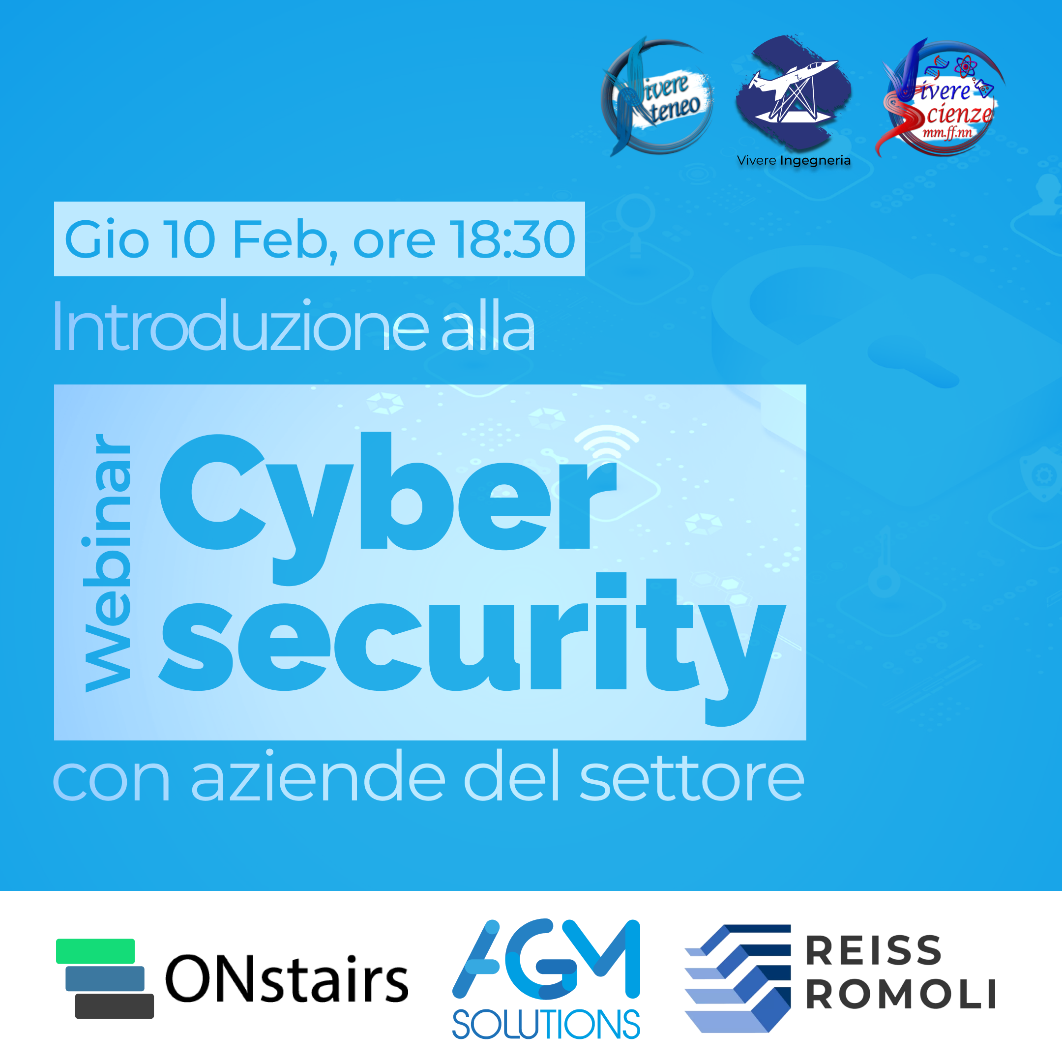 Vivere Ateneo, Vivere Ingegneria e Vivere Scienze MM.FF.NN. sono liete di informare la comunità studentesca di un evento che si terrà Giovedì 10 Febbraio 2022 a partire dalle ore 18.30 che coinvolgerà tre aziende operanti nell’ambito della Cybersecurity: ONstairs, AGM Solution e Reiss Romoli.